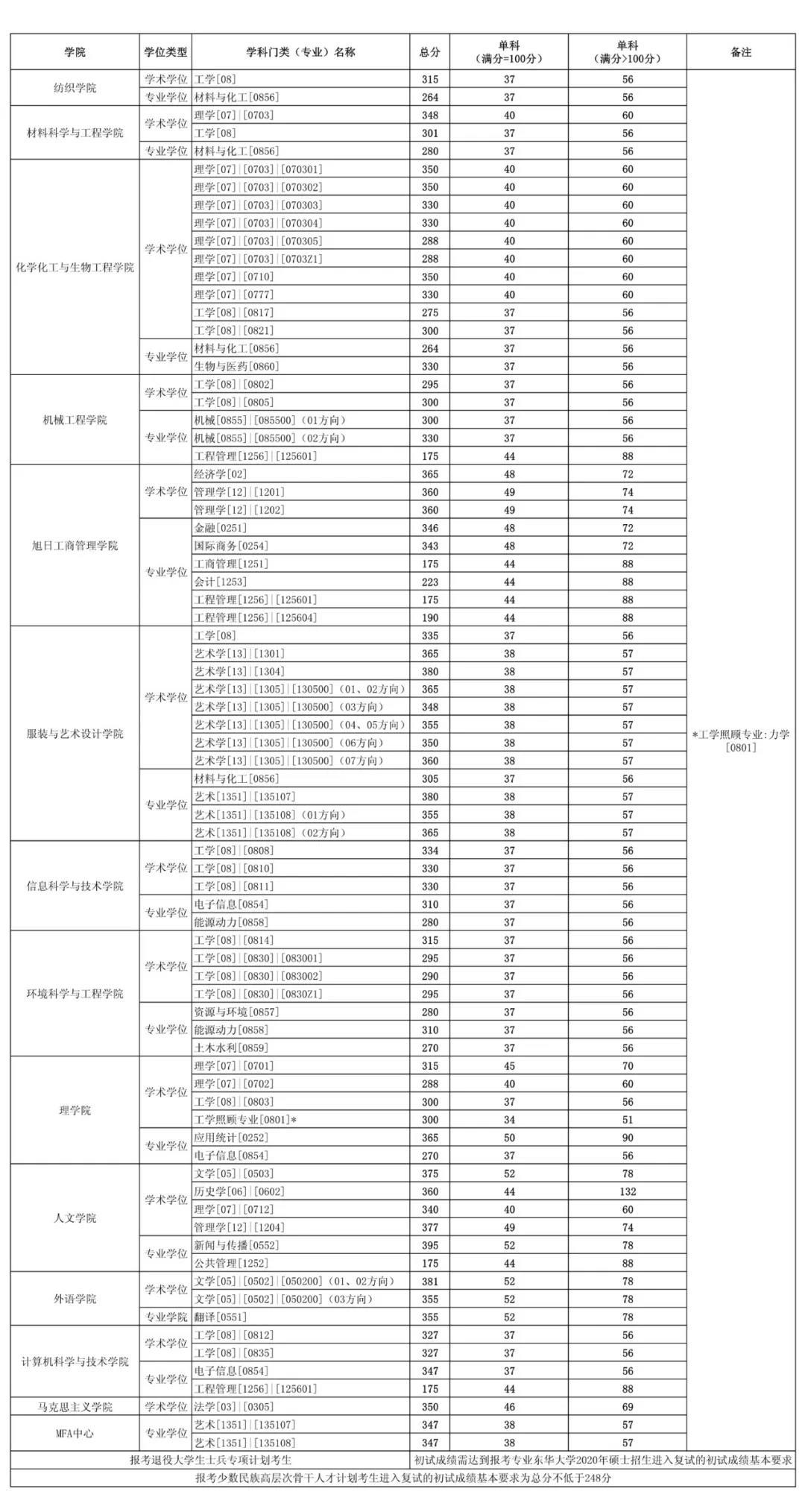 东华大学2020年硕士研究生招生考试考生进入复试的初试成绩基本要求