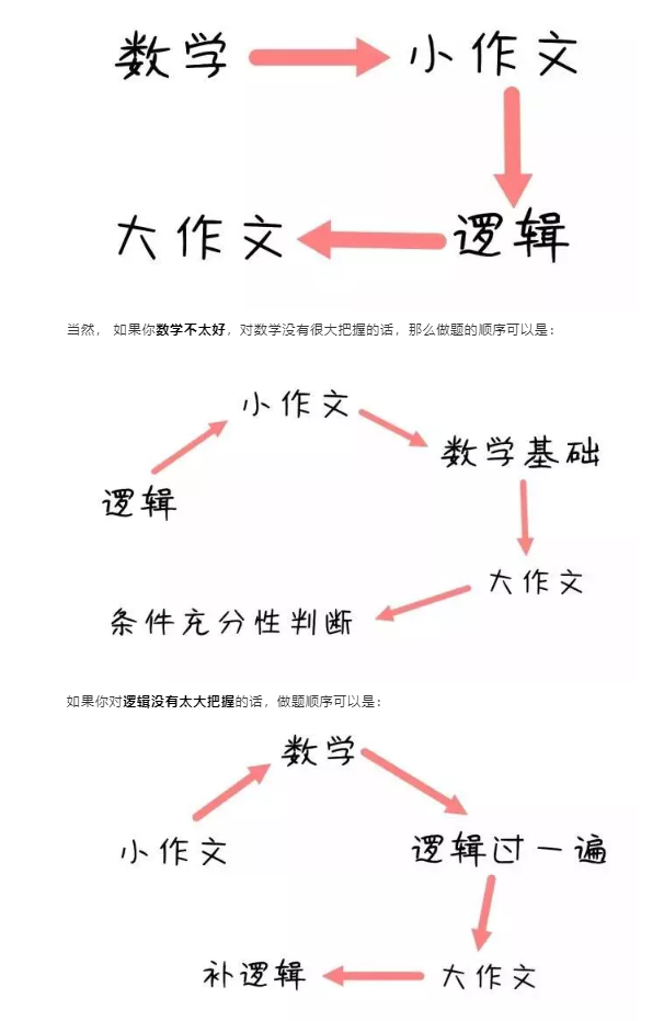 大小作文自不必多说。数学的前15题比条件充分性判断更容易得分,要尽量做到不丢分。后10题一旦超过预计的做题时间,立即跳转下一题。