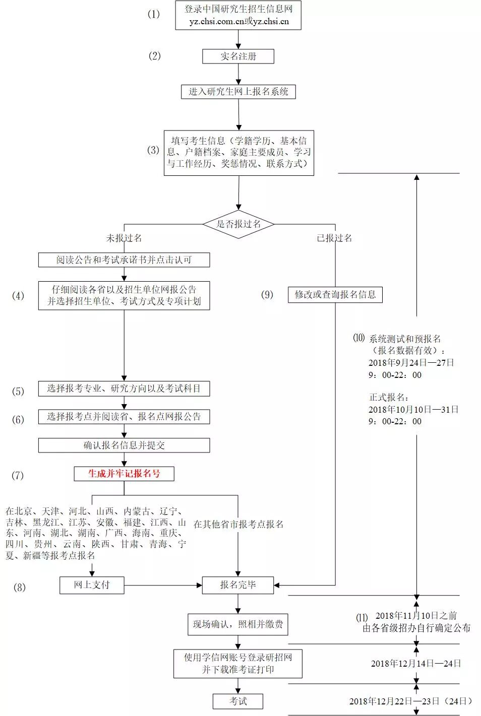 网上报名时间为2018年10月10日至10月31日,每天9:00-22:00。预报名时间为2018年9月24日至9月27日,每天9:00-22:00。