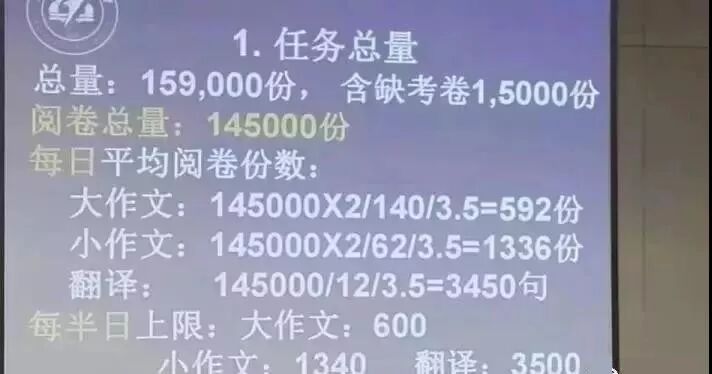 下图是某年帝都阅卷现场某阅卷老师的偷拍图,以大作文为例,大家是否注意到日均批阅量为592份,而大作文半日上线为600份,也就是说大作文的批阅时间是18~36秒之间!