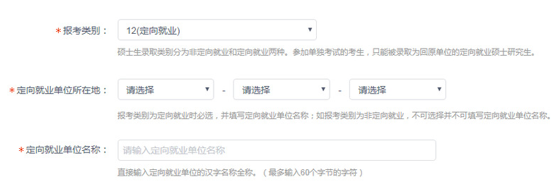 (1)非全日制:报考类别中报考非全日制项目请选择“12(定向就业)”(请填写当前就业信息,如未来工作变化不影响报考和录取)。