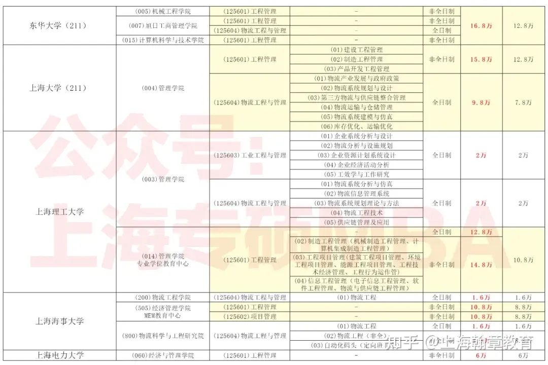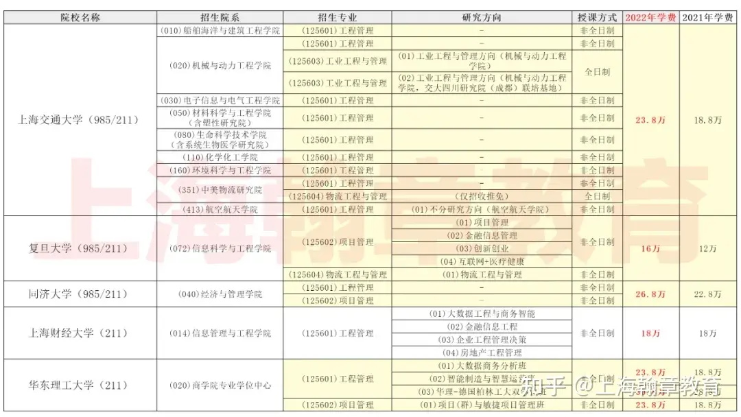 MEM即工程管理硕士,旨在培养“工程技术+经济+管理”高端复合人才。随着信息技术时代的来临和高新技术产业的迅猛发展,工程管理的社会实践与应用前景是非常广阔的2019年,原工程管理硕士(125600)被拆分,改设立工程管理(125601)、项目管理(125602)、工业工程与管理(125603)、物流工程与管理(125604)四个招生领域。工业工程与管理和物流工程与管理自2020级起在5年试点期间可以招收应届生(包括推免和全国联考)。工程管理和项目管理依然需要满足本科毕业并有三年或三年以上工作经历,或硕博毕业并有两年或两年以上工作经历,或大专毕业并有五年或五年以上工作经历的硬性要求。为了帮助各位想要报考上海MEM的同学清晰对比学费、选择适合自己的项目,小编为大家整理了上海地区MEM学费,不用麻烦大家四处查询了,建议收藏哦!上海高校MEM学费汇总*看不清可点开放大,黄色部分为学费变动项目