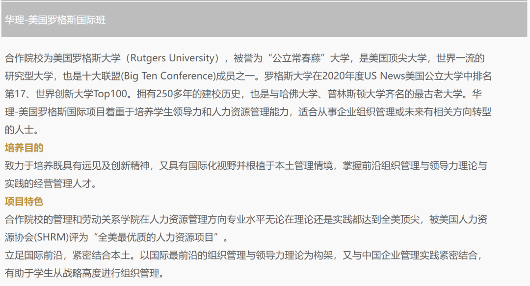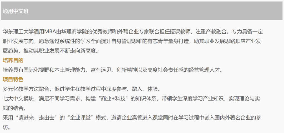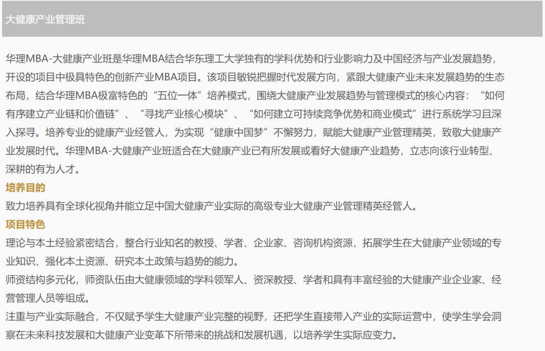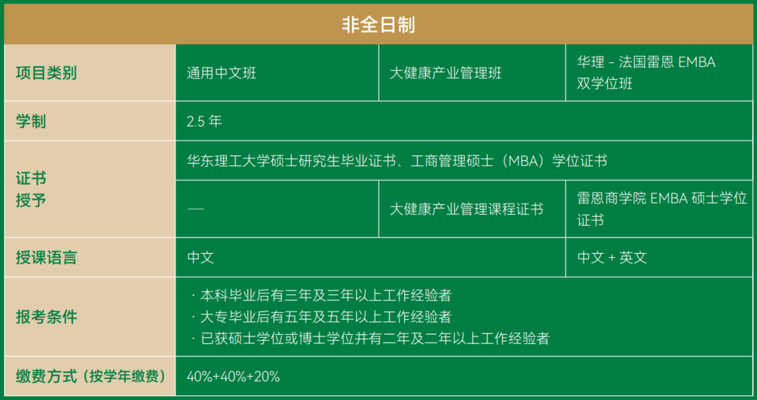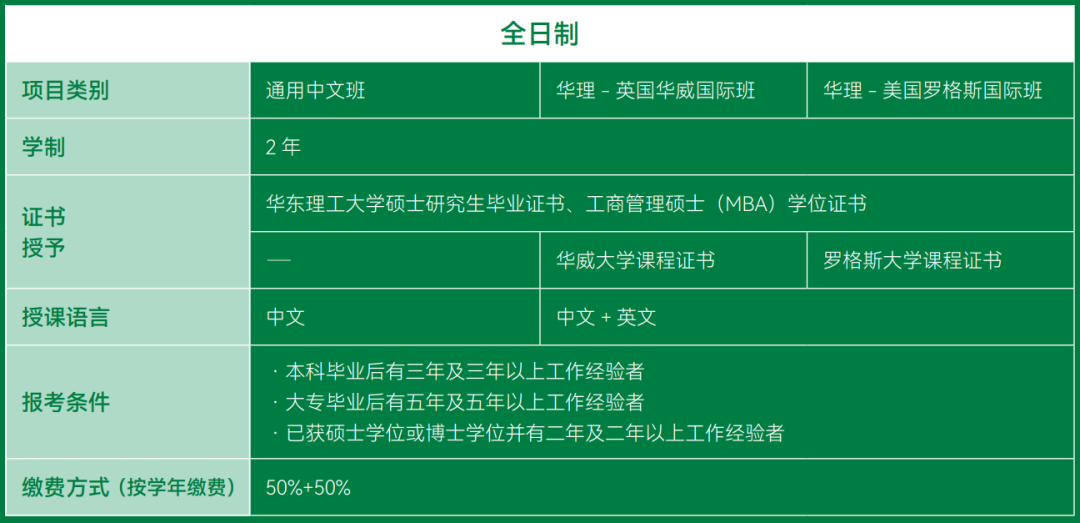 华理MBA项目设有全日制(学制2年):通用中文班、华理-美国罗格斯国际班、华理-英国华威国际班;非全日制(学制2.5年):通用中文班、大健康产业管理班。