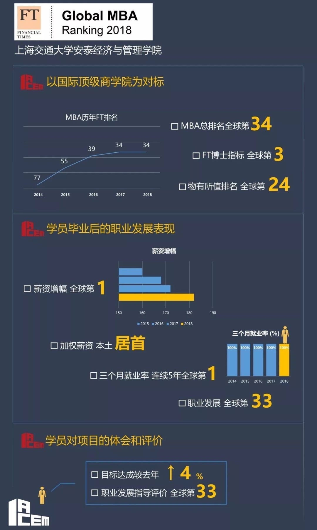 我们以上海交大安泰为例,根据FT公布的数据显示,上海交大安泰MBA学生毕业后3年平均年薪达到85.5万人民币,交大安泰MBA薪资增长率和就业率蝉联全球第一,薪资增幅高达180%多。