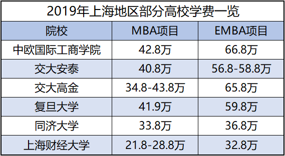 以上海交大安泰管理学院为例,交大安泰2019年的MBA项目学费为40.8万,而同年的EMBA项目学费为56.8万。还有相当比例的外地EMBA学员,不得不在周末飞来飞去,交通费也是一笔不小的开支,更别谈去国外企业实地考察的费用。