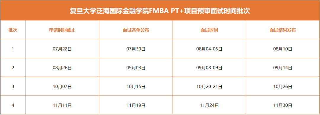 复旦大学泛海国际金融学院FMBA PT+项目将对获得预审面试资格的考生进行预审面试,并且根据预审面试总成绩确定预审面试结果。