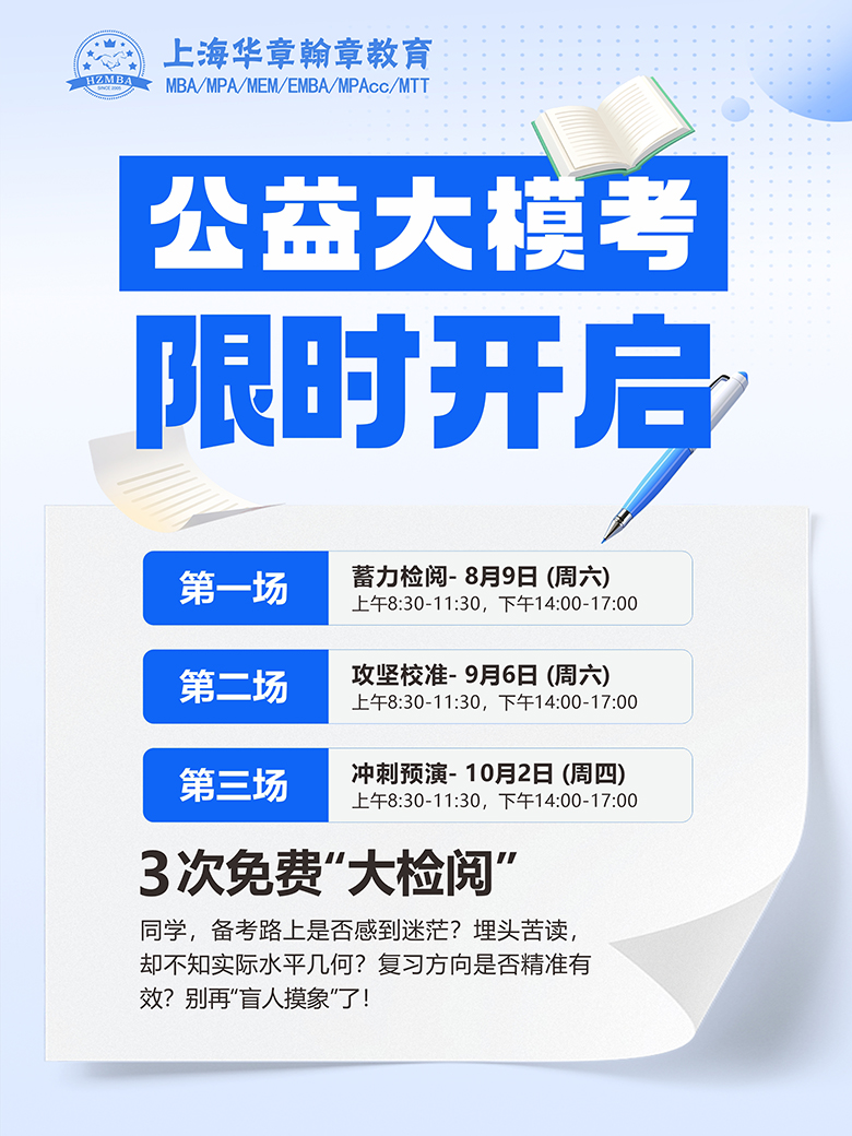 告别“盲人摸象”式的备考,让数据说话!上海翰章专硕MBA倾力打造的 【公益全真模考系列】第一场“蓄力检阅” 将于本周六(8月9日) 正式举行。这绝非普通练习,而是您备考路上的关键“探照灯”与“导航仪”,助您科学评估、精准定位、高效冲刺。