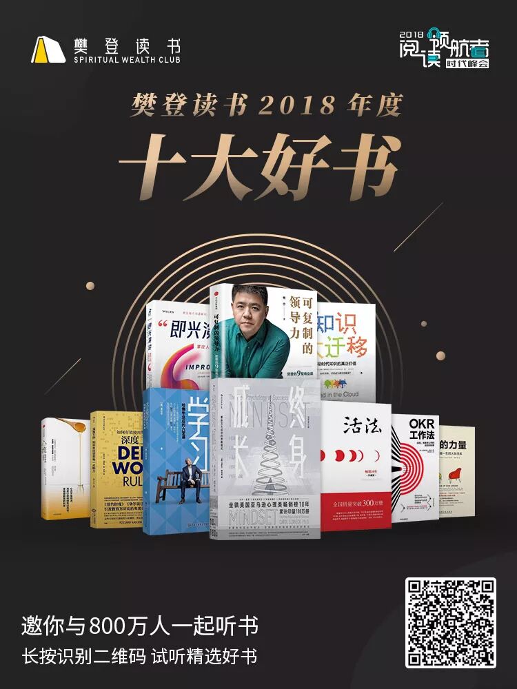 会上,通过十位重量级嘉宾,从中分别揭晓了2018年度樊登读书平台上的”十大好书“,根据总收听量、24小时收听量、评论数、点赞数等指标综合考量,《知识大迁移》《可复制的领导力》《他人的力量》《OKR工作法》《终身学习》《深度工作》《终身成长》《活法》《心流》《即兴演讲》入选。