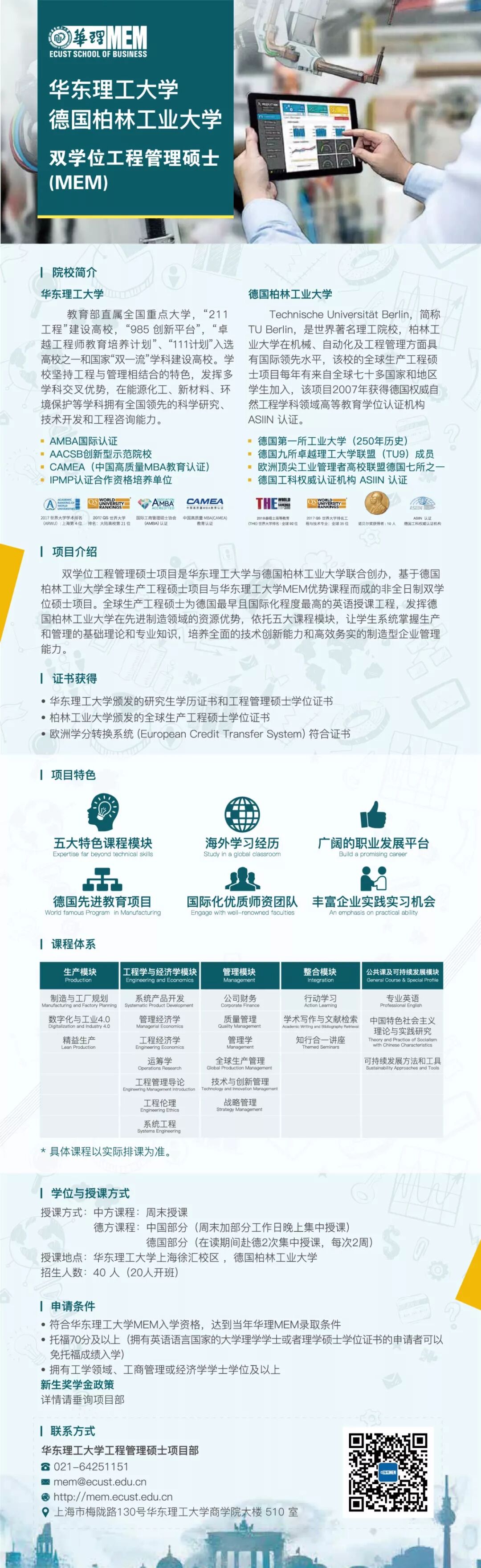 华东理工大学-德国柏林工业大学双学位工程管理硕士(MEM)