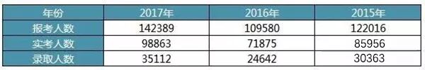从近三年招录人数分析,报考人数大致以2万左右递增,实考人数紧跟上升,录取人数稳定在3万人上下浮动。从长远数据看,每隔2-3年录取人数会有一次跃升。