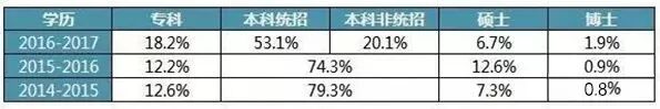 从学历看,本科和硕士报考人数略有下降,专科和博士报考人数略有上升。由此可推出,本科和硕士竞争相对专科、博士的较小,录取几率较大,但也不能放松警惕,要认真备战。