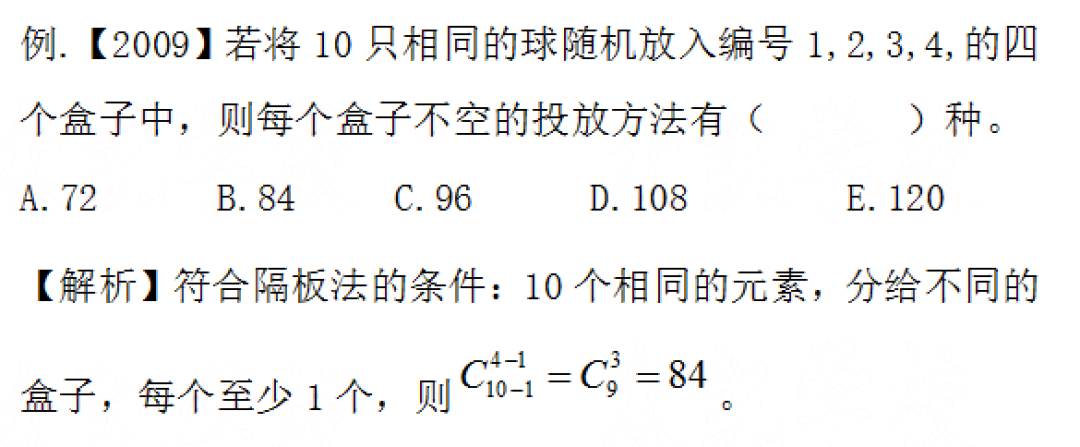 “至多”“至少”这样的考点,在概率问题中出现时,还经常会查考考生对“隔板法”的使用