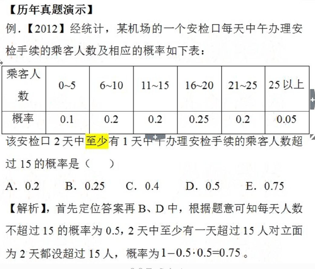 在解决数据分析中出现的“至多、至少”问题时,最快的解决方法就是从反面,而且这个时候,如果是概率问题,那么答案基本上就在选项和为“1”的两个选项中。