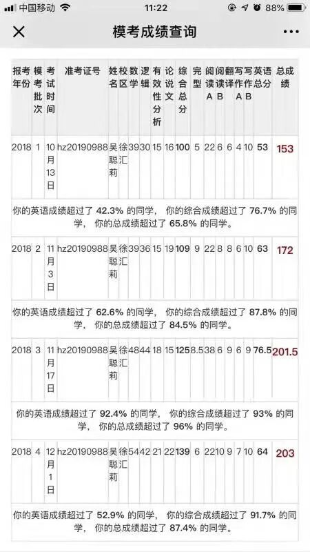 (4)坚持到底,决不放弃。不止一位老师讲过:考场上,无论考得怎么样,一定要坚持到底,不能做那些“上午考完下午就不来了”的人。这次的考试,让我对此有了深切的体会。2018年的综合考试考得我“生无可恋”——平时的数学卷、历年卷第1题不会很正常,大部分上来都会打击一下,也习惯了,可是正式考那天,第1题,不会,第2题,算不出,第3题,没思路……等选择题做完一看,快1个小时了。真是欲哭无泪!说好的每门课一个小时呢?说好的掌握节奏呢?赶紧调整心态,紧赶慢赶,最终还是有几题逻辑题没来得及做。这种连题都来不及看完的情况在最后两次模考中已经不会出现了,结果正式考中出现这种状况,让我对这次考试的结果很是忐忑。但是不管怎么样,下午的英语还是硬着头皮上了。相比上午的打击,下午的考试简直可以说是“如沐春风”,不说简单到易如反掌,但也确实抚慰了受伤的心灵,让我再次燃起了希望。晚上一发朋友圈,还真有朋友说下午弃考了,不免为之惋惜一把。所以大家一定要切记:上了考场,不管自己觉得考得怎么样,一定一定一定要坚持到底!坚持到底就是胜利!