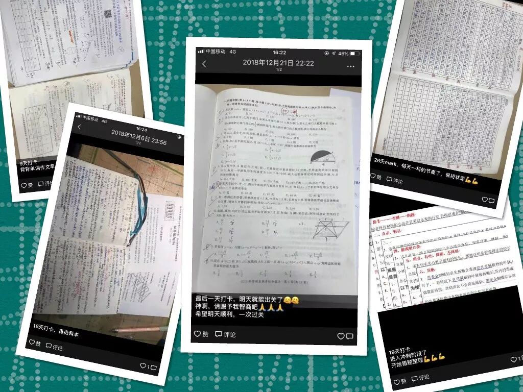 (3)每天打卡,保持状态。前面说到信念很重要,那如何保持信念呢?我是这么做的——微信朋友圈每天打卡。一开始,班主任要求英语背单词每天小组群里接龙打卡。慢慢的,养成习惯了。等到英语单词复习的接龙打卡结束后,忽然有些不习惯,总觉得少了点什么。于是,把打卡的习惯搬到了朋友圈,同时,进入倒计时时间。有时候,想偷懒了,看看朋友圈那么多天的打卡和倒计时,就会告诉自己:快了快了,再坚持一下!到最后模考冲刺阶段,就把每天复习的内容晒在圈里,不是为了给谁看,只是为了给自己一个交待,看看当天的复习任务是否都完成了、完成了多少,同时也提醒着自己离终点越来越近了。