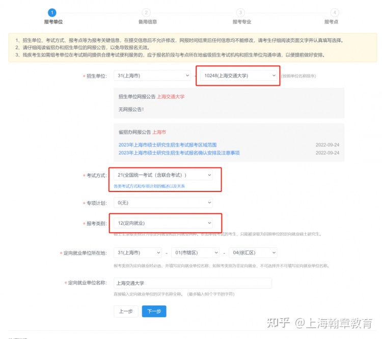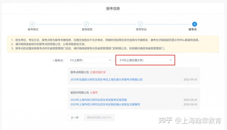 【注意】选择“3105(上海交通大学)"考点的条件是:在上海市工作(需具有本人 2022 年连续六个月的上海社保缴费成功记录)的考生,或上海市户籍考生(需具有上海市户口簿);选择“4411(深圳市招生办公室)"考点的条件是:工作或户口所在地是广东省的往届毕业考生。
