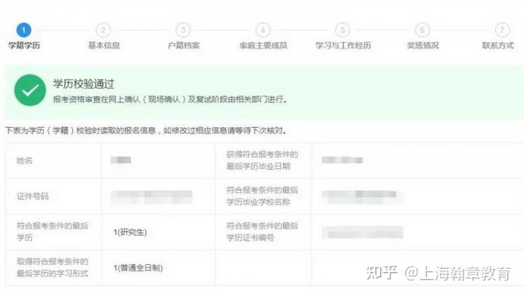 【注意】一般情况下,学历信息是可以快速校验的。如遇网络拥堵等特殊情况,将出现“进行中”的状态,考生可以继续填写考生信息中的其他部分,不影响接下来的操作。未能通过学历网上校验的考生,请务必仔细核查并更正填报的姓名、证件号码、毕业学校、毕业年月、学历、学历证书编号、学习形式等信息。