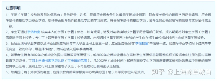 ① 学历校验由学信网免费提供,仅用来校验考生在网上报名系统中填写的学历信息与全国高等教育学历电子注册数据是否一致。② 考生可通过学信网“学信档案”核实本人的学历信息,如有疑问,请及时与就读院校学籍学历管理部门联系。③ 鉴于学历数据可由学籍学历管理部门动态维护,本次校验不代表最终结果,校验结果在网报系统开放期间将定时更新。④ 网上校验结果仅供参考,考生是否具有报考资格由报考点及招生单位根据相关文件确定。