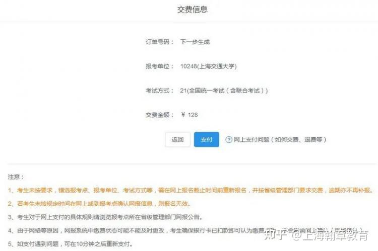 今年网上报名期间,所有考生均须通过研招网进行网上缴费。考生需及时前缴纳考试费,否则报名无效。由于网络等原因,网报系统中缴费状态可能不能及时更改,考生确保银行卡已扣款即可认为缴费成功,不会影响网上确认(现场确认)。如支付遇到问题,可在10分钟之后重新支付。