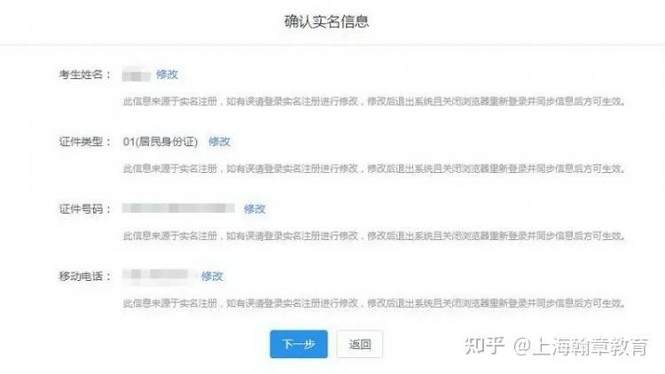 完成全部考生信息的填写后,确认您所填写的信息。如无需修改,点击“确认”,如需要修改,点击“上一步”。“确认”个人信息后,“回到首页”进行“报考信息”的填写。