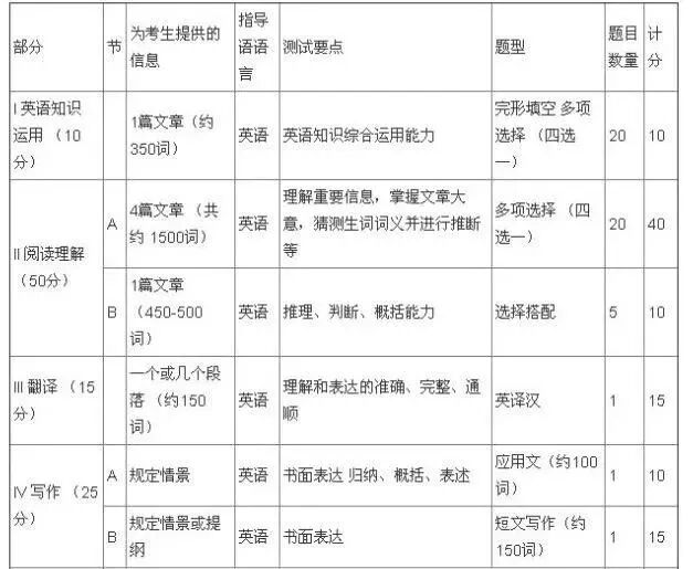 该表格较为直观地说明了英语考试的试卷结构,通过分析我们不难发现,阅读部分最为关键,占到整个考试的半壁江山,即“得阅读者得天下”;主观题部分翻译和写作占到40%,同样不可小觑。