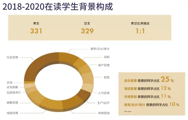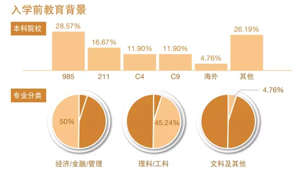 金融MBA的全日制项目首期班由50余名来自北京大学、清华大学、复旦大学、南京大学、中国人民大学、武汉大学、牛津大学、伦敦政治经济学院等全球著名院校的优秀学子构成,他们100%毕业于211及海外院校,76%毕业于985及海外院校。其中不乏来自美国、加拿大、法国、摩洛哥、新加坡、印度、哥伦比亚和中国香港和中国台湾的考生,项目国际化程度高,港澳台国际学生超过20%。