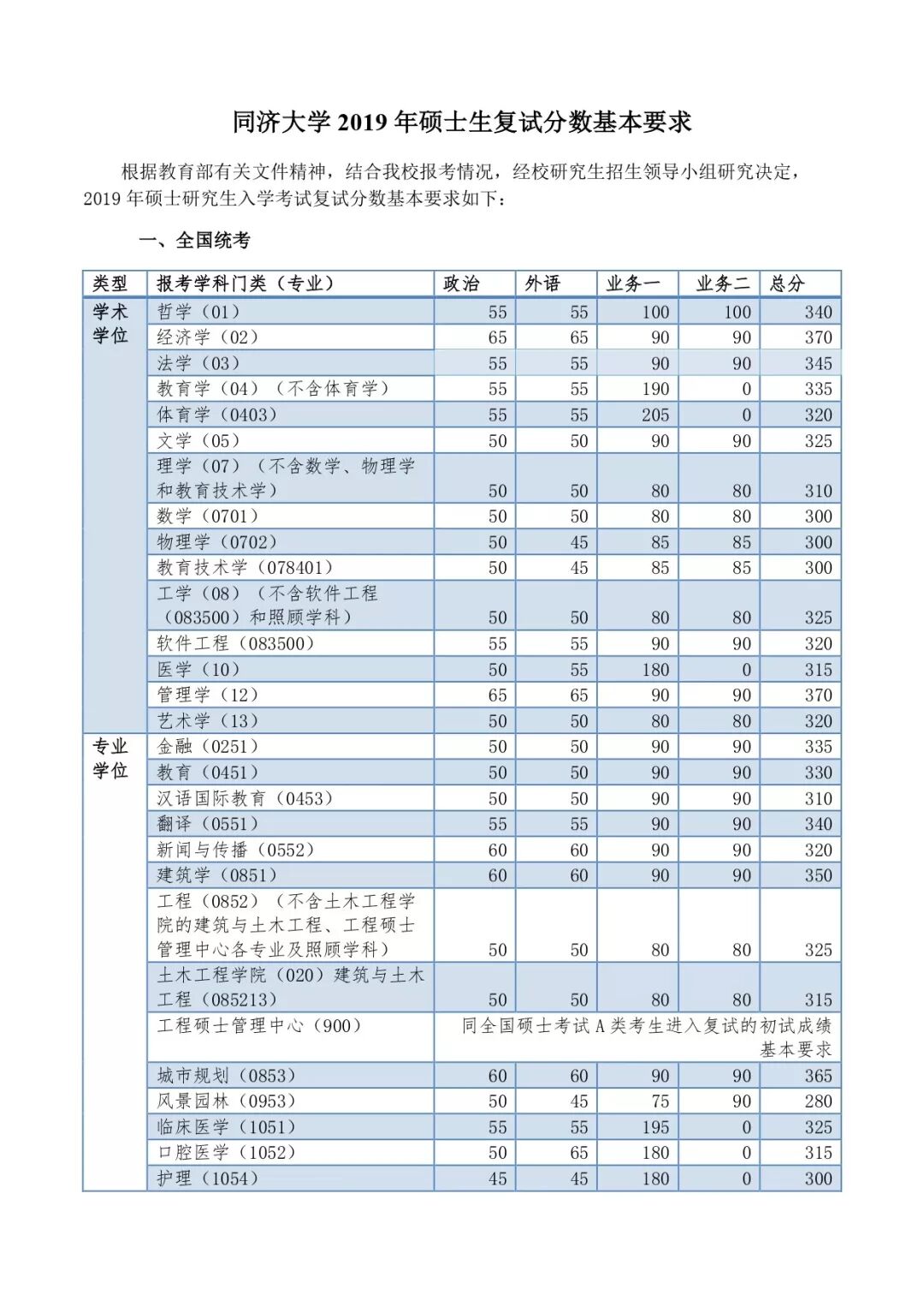 同济大学2019年硕士生复试分数基本要求