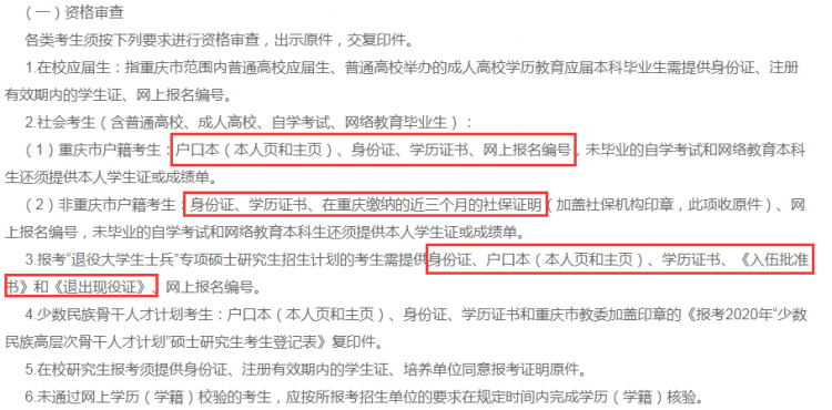 普通高校及成人高校往届生且户籍地在重庆的,需提供本人居民身份证、户口簿、学历证书;若户籍地不在重庆的考生,还需提供在重庆缴纳的近三个月的社保证明。