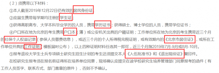 以北京师范大学为例,考点现场确认时往届生须提供在京户籍证明,户籍非京籍考生须提供社保个人权益记录/个人所得税完税证明/《北京市居住证》/工作证明(四选一),应届生须提供京籍高校学生证。