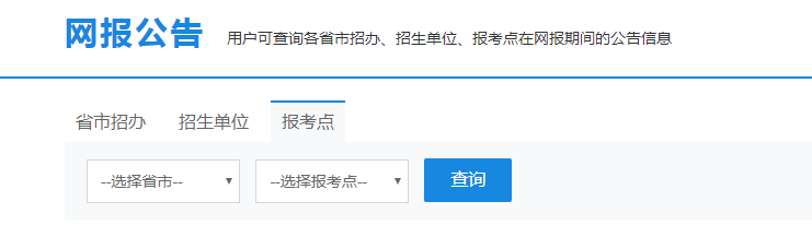 点开网报公告后,会出现“省市招办”、“招生单位”、“报考点”三个选项,大家可以根据自己的需求来查找。