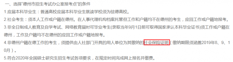 以德州市报考点为例:非德州户籍在德工作的考生,须提供由人社部门开具的用人单位为其缴纳的社会保险证明(缴纳期限须涵盖2019年8、9、10月)。