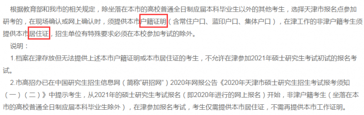 除坐落在本市的高校普通全日制应届本科毕业生以外的其他考生,选择天津市报名点参加研考的,在现场确认或网上确认时,须提供本市户籍证明(含常住户口、蓝印户口、集体户口),在津工作的非津户籍考生须提供本市居住证,招生单位有特殊要求必须在本校参加考试的除外。