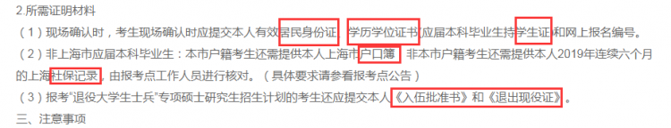 非上海市应届本科毕业生:本市户籍考生还需提供本人上海市户口簿,非本市户籍考生还需提供本人2019年连续六个月的上海社保记录,由报考点工作人员进行核对。
