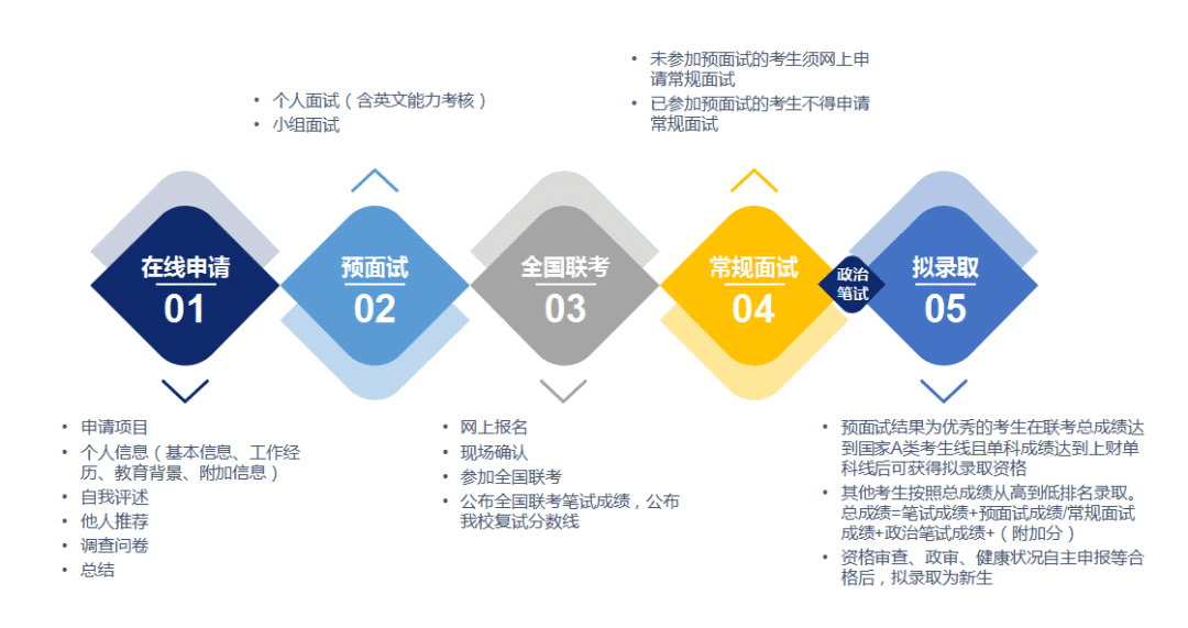 2. 如预面试后有转班需求,必须在联考报名前参加转班面试,且面试成绩以转班面试成绩为准,原预面试成绩予以作废。具体转班面试申请信息请留意官网和本微信公众号通知。