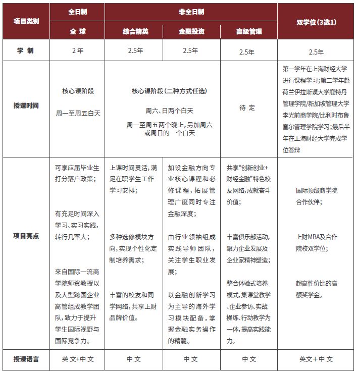 2020年上财MBA项目设有全日制-全球班、非全日制-综合精英班、非全日制-金融投资班、非全日制-EMBA,各项目概况详见下图: