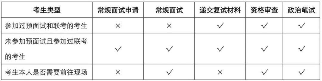 联考成绩公布后,不同类型的考生需要参加的复试环节说明如下: